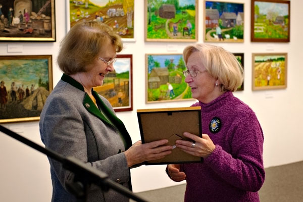Nominantų pasveikinti atvykę valdininkai santūriai spietėsi būreliais, fotografai kuklius nominantus glumino be jokių ceremonijų pliaukšinčia objektyvų gausa. Bet juk taip ir reikia, nes istorija liks be jos įvykius tapybos darbuose atspindinčiųjų atvaizdų... Gal tik išmintingasis, nuoseklusis dokumentalistas A.Tarvydas, savo gyvenimo tikslu pasirinkęs įamžinti garbiausius Lietuvos kūrėjus, ramiai grožėjosi susirinkusiais, nes savo juostoje dar spėjo įamžinti pačią M.Bičiūnienę, kurią tądien susirinkusieji turėjo galimybę pažiūrėti. Salę puošė ne tik kūrėjai, bet ir, mano pastebėjimu, net trijų Bičiūnų šeimos kartų atstovai. Tai dar viena retai pakartojama, puiki tradicija, kaip pagerbti anapilin išėjusį savo šeimos narį ir palikti jį amžinai gyvą bėgančiame laike. Nenuilstanti tautos meno globėja, Utenos savivaldybės darbuotoja Zita Mackevičienė, kaip visuomet buvo lyg tikra mama savo rajono žmonėms-kūrėjams. Kiekvienas paglobotas, kiekvienas apdovanotas, o dar ir pavedimas kilnus atliktas: vienintelė LR Seimo narė, socialdemokratė M. Petrauskienė (ten ginanti Utenos interesus) prie sveikinimų ir dovanomis prisidėjo. Kauniškius sveikino LR Seimo narys Jankauskas, gražu, kad jie rado reikalą padėkoti ir kultūros darbuotojams, suburiantiems kūrėjus regionuose. O didžiausios padėkos už gerą, kartais kritišką, bet teisingą žodį, visada šiltą ir gerbiantį žodį teko visus „juodus“ ir paprastai niekieno nepastebimus darbus nudirbusiai puikiajai Ramutei Kraujalienei.